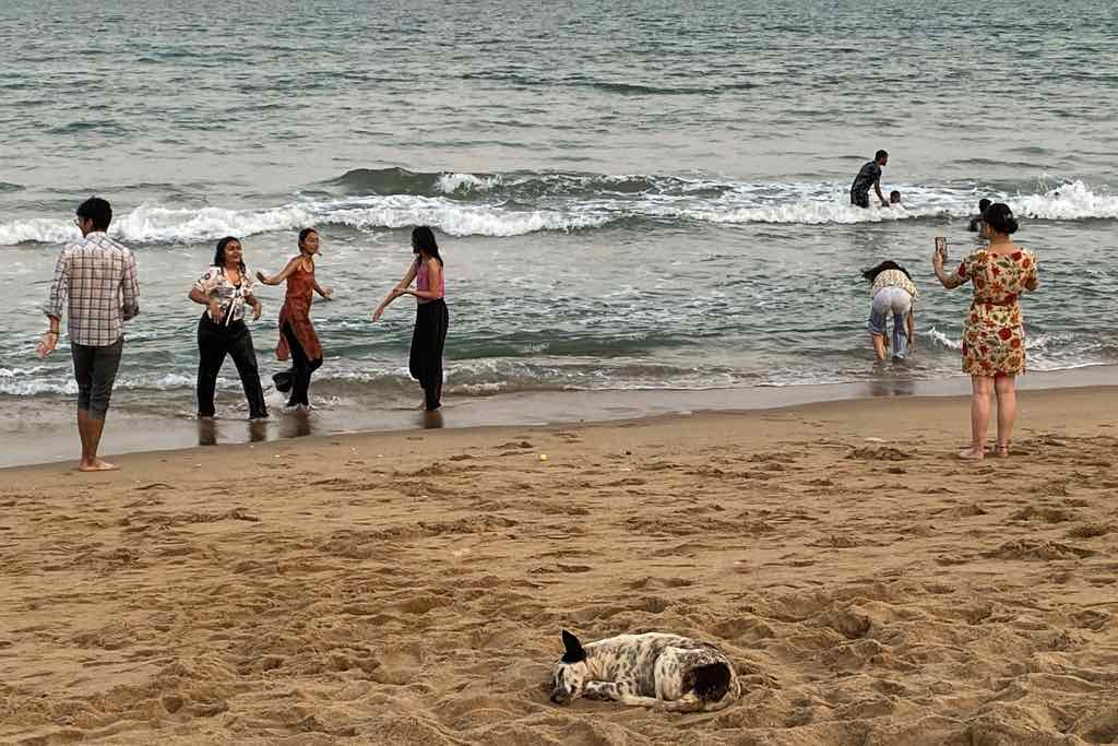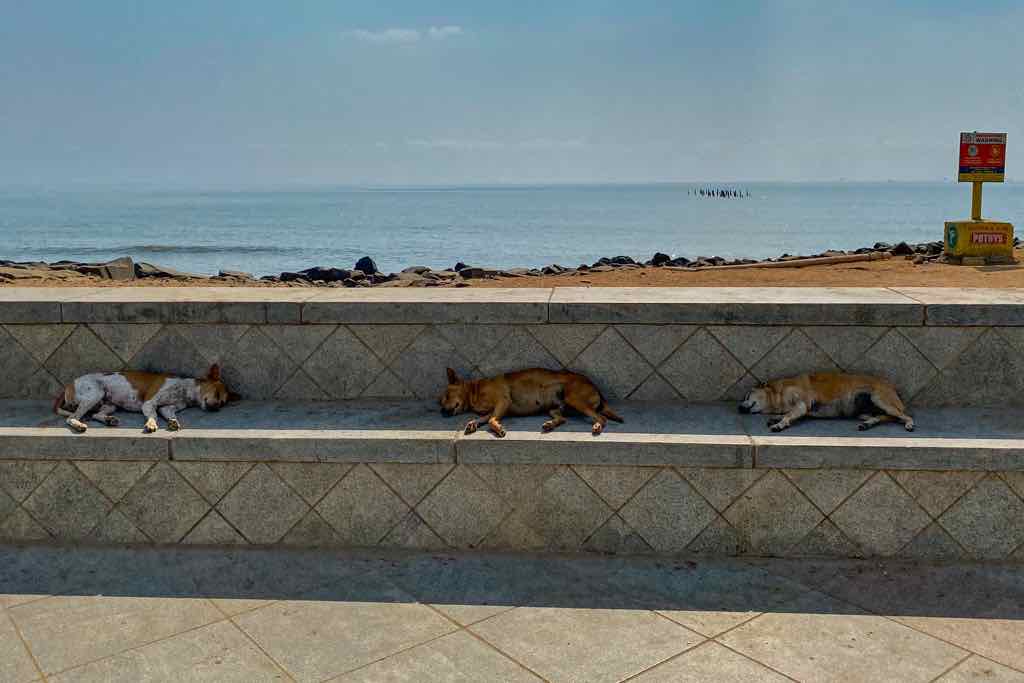 • South India, Tamil Nadu, Bengal Sea, Dogs looking for Freshness in the Sand